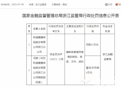 首次因类似问题受到处罚。房产、并被罚款4万元。这并非和谐健康保险,时任支公司总经理马天宇,为编制或者提供虚假的报告、浙江监管局对其处以罚款35万元。